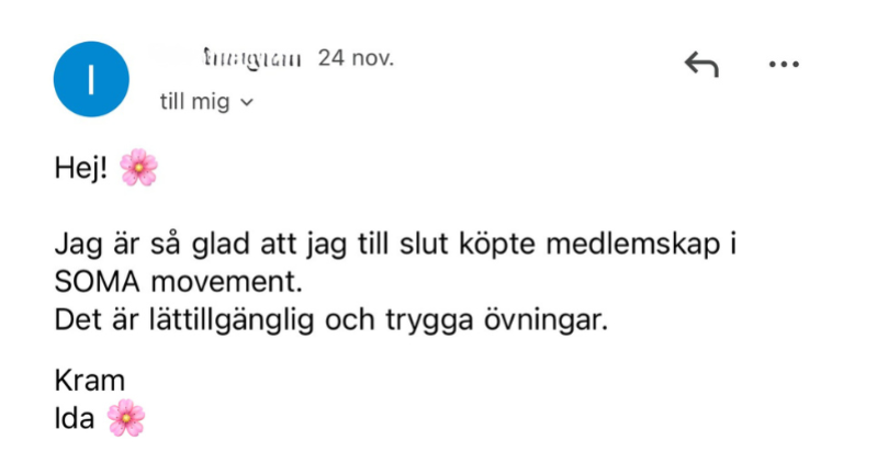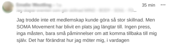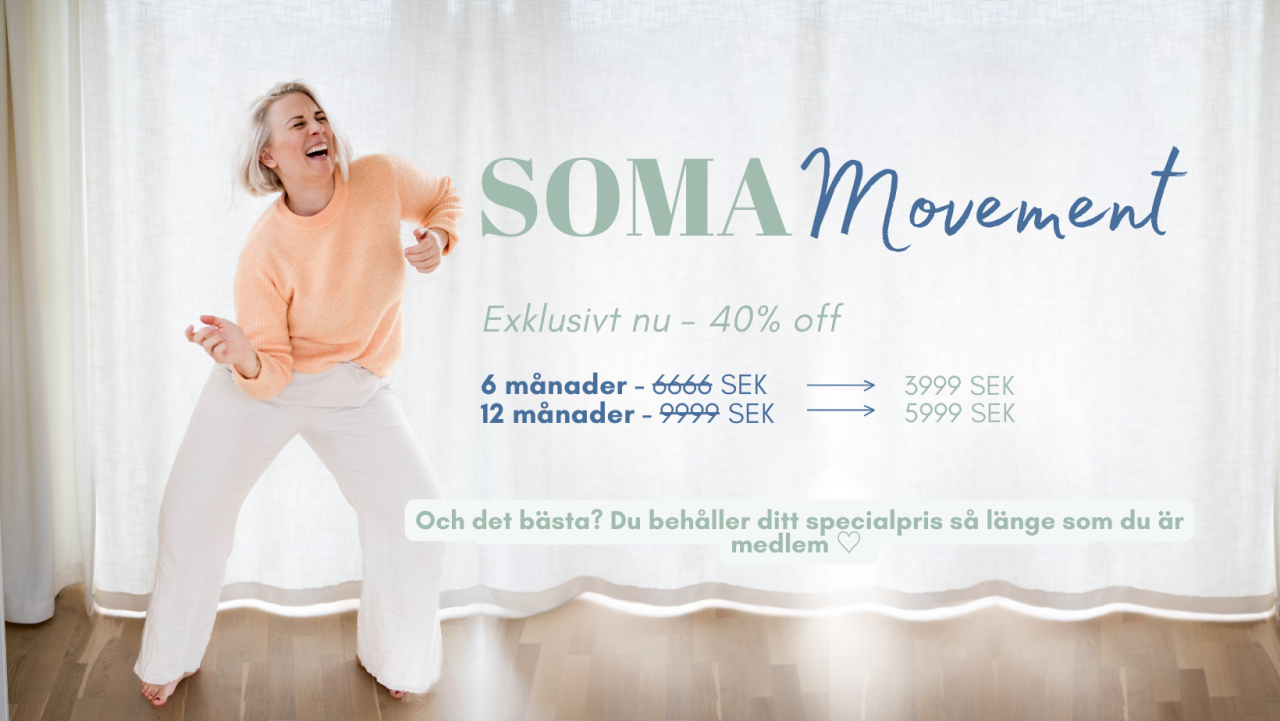 När du går med i SOMA Movement väljer du mellan års- eller halvårsmedlemskap. Du binder dig bara för den period du själv valt, och därefter förnyas det automatiskt. Om du vill avsluta innan nästa period startar, säger du bara upp det innan förnyelsen (inne på kursplattformen) — enkelt och utan krångel.