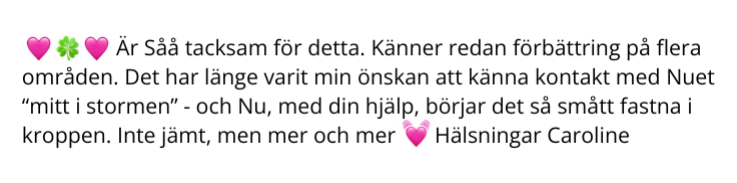 Du behöver inte fler tips, fler quick fixes eller fler saker att prestera dig igenom. Du behöver nya erfarenheter i kroppen som steg för steg lär ditt nervsystem att det är tryggt att vara du. Det är grunden för att kunna vila, återfå energi, sätta gränser, släppa stress och faktiskt leva – inte bara överleva.